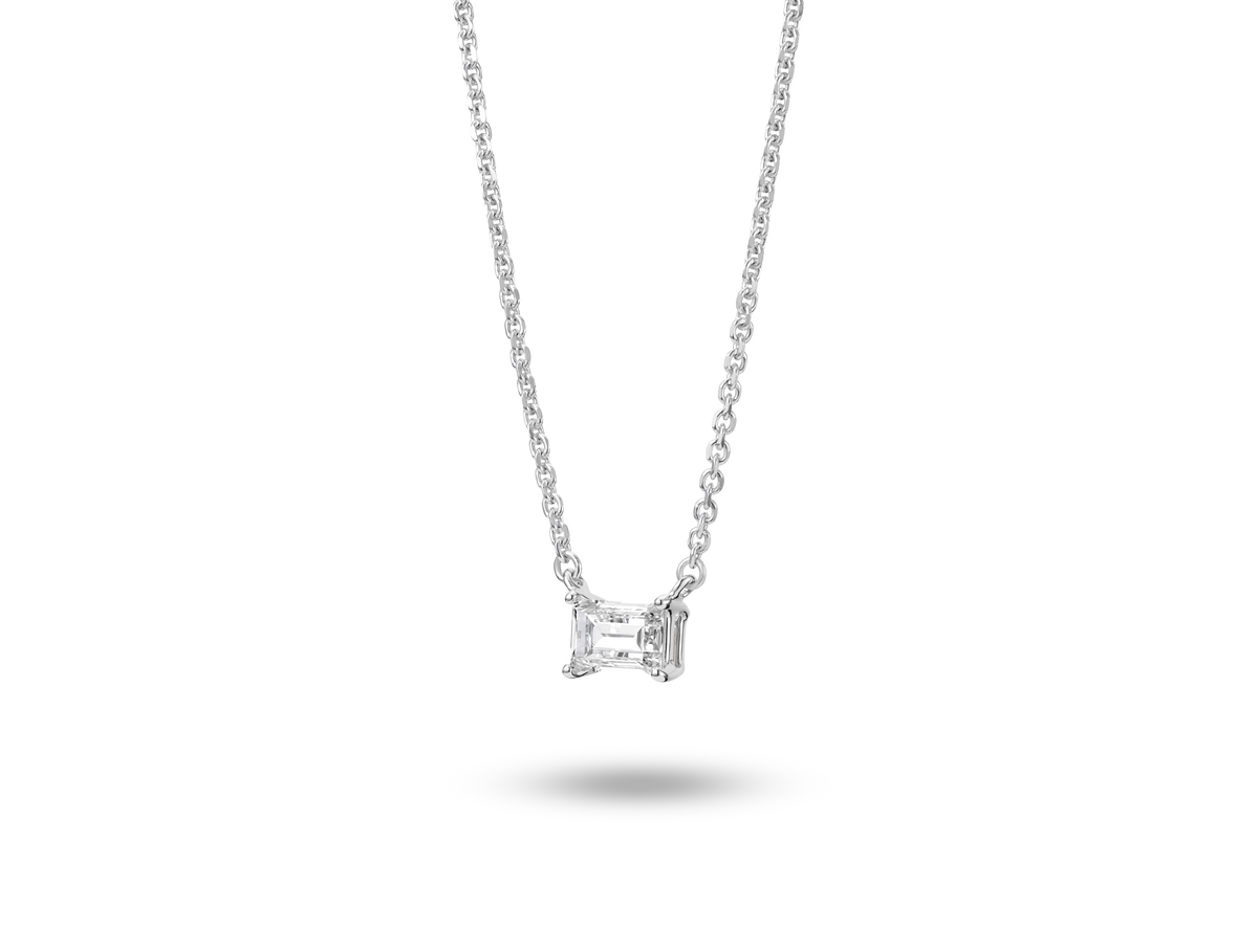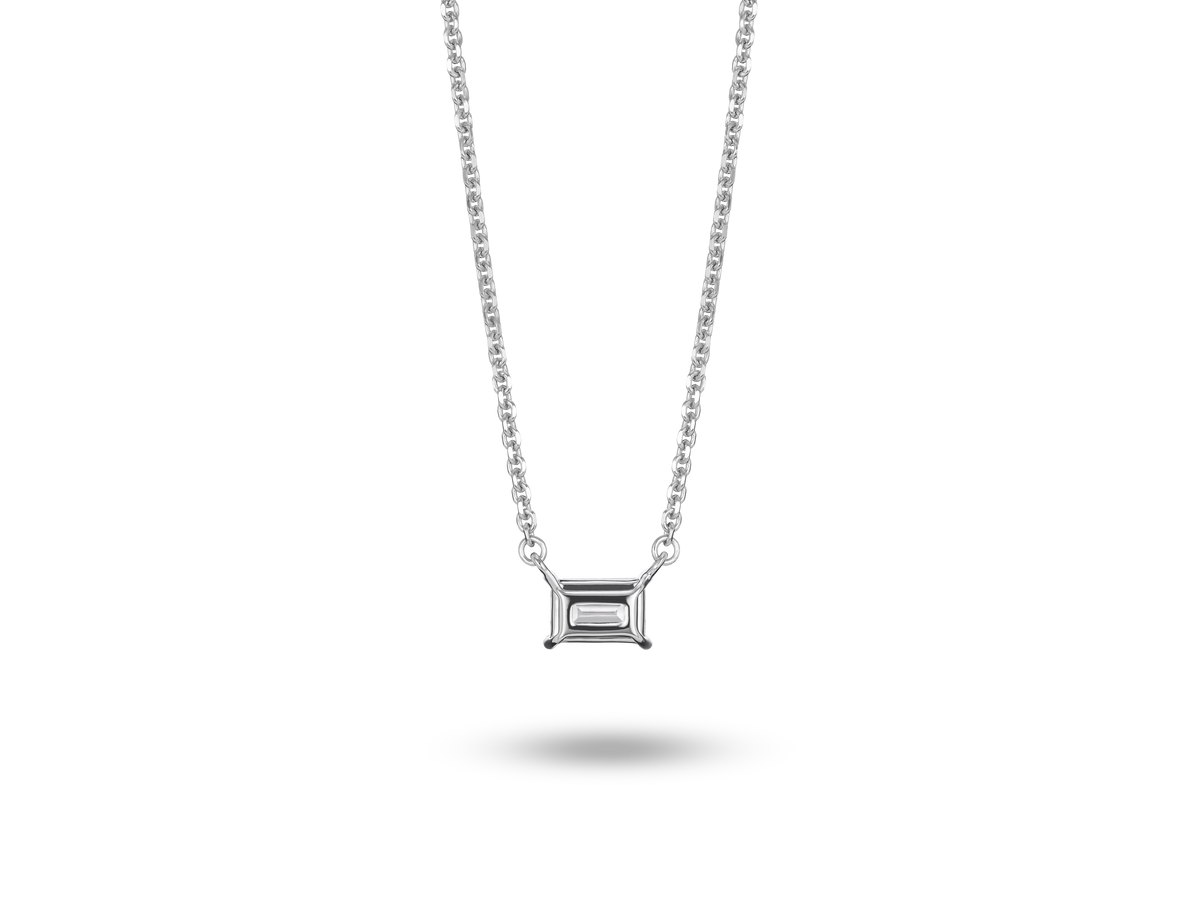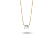 This baguette cut pendant offers a timeless, Art Deco inspired appeal that will become your new everyday accessory. Available in 14k white or yellow gold to suit your preference, it’s great for layering. The ¼ carat stone is graded at VS+ clarity, Near Colorless and grown from 100% renewable wind energy.
