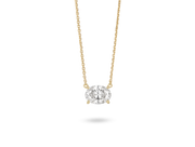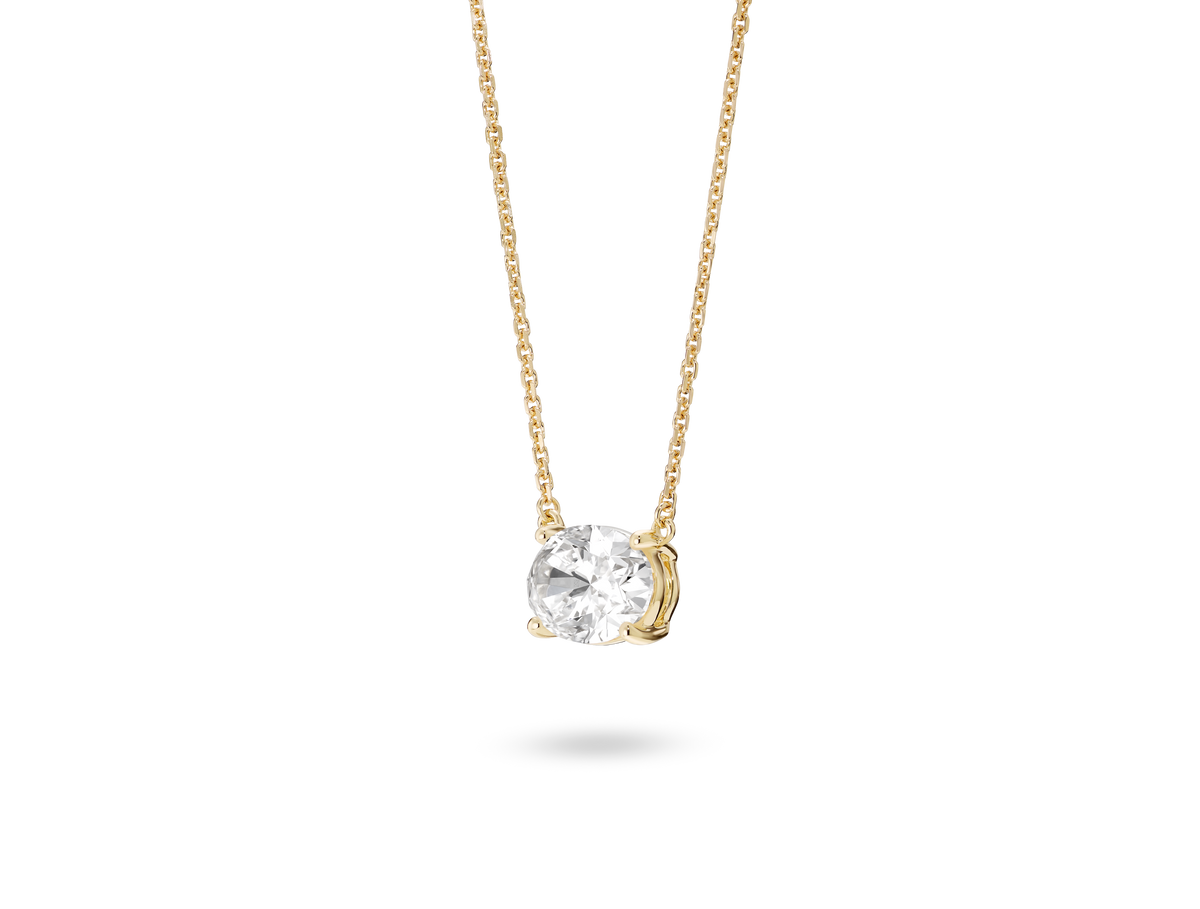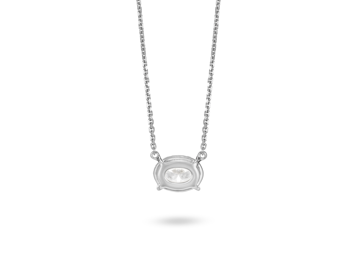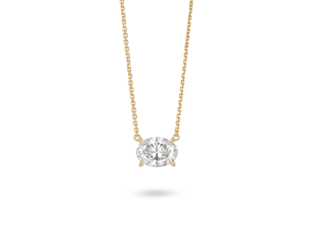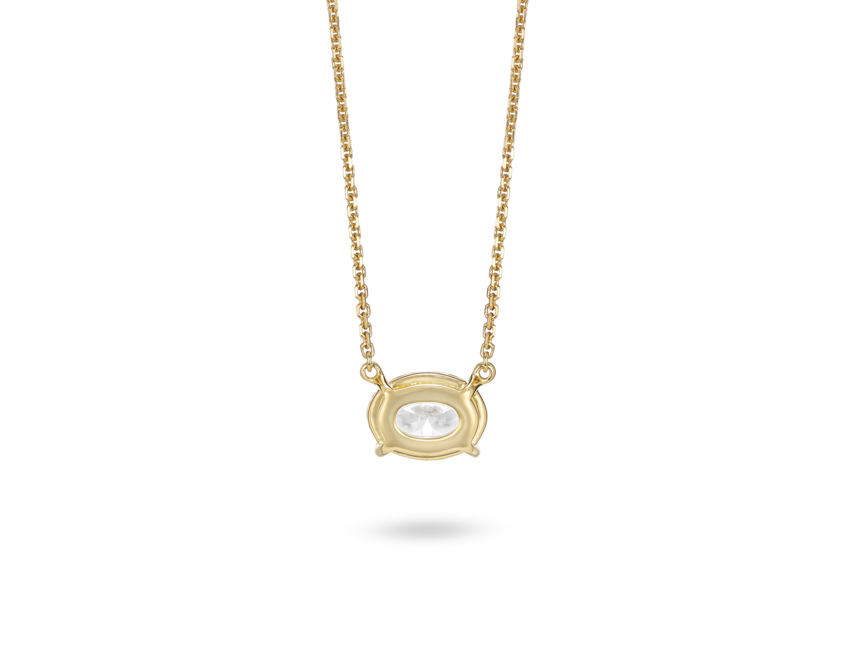 A classic solitaire necklace but in a modern east/west setting. Held in a 14k gold, four prong setting the 1 carat oval cut stone is of VS+ clarity, Near Colorless and proudly grown from 100% renewable wind energy in our lab in Portland, Oregon.