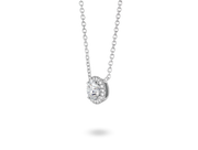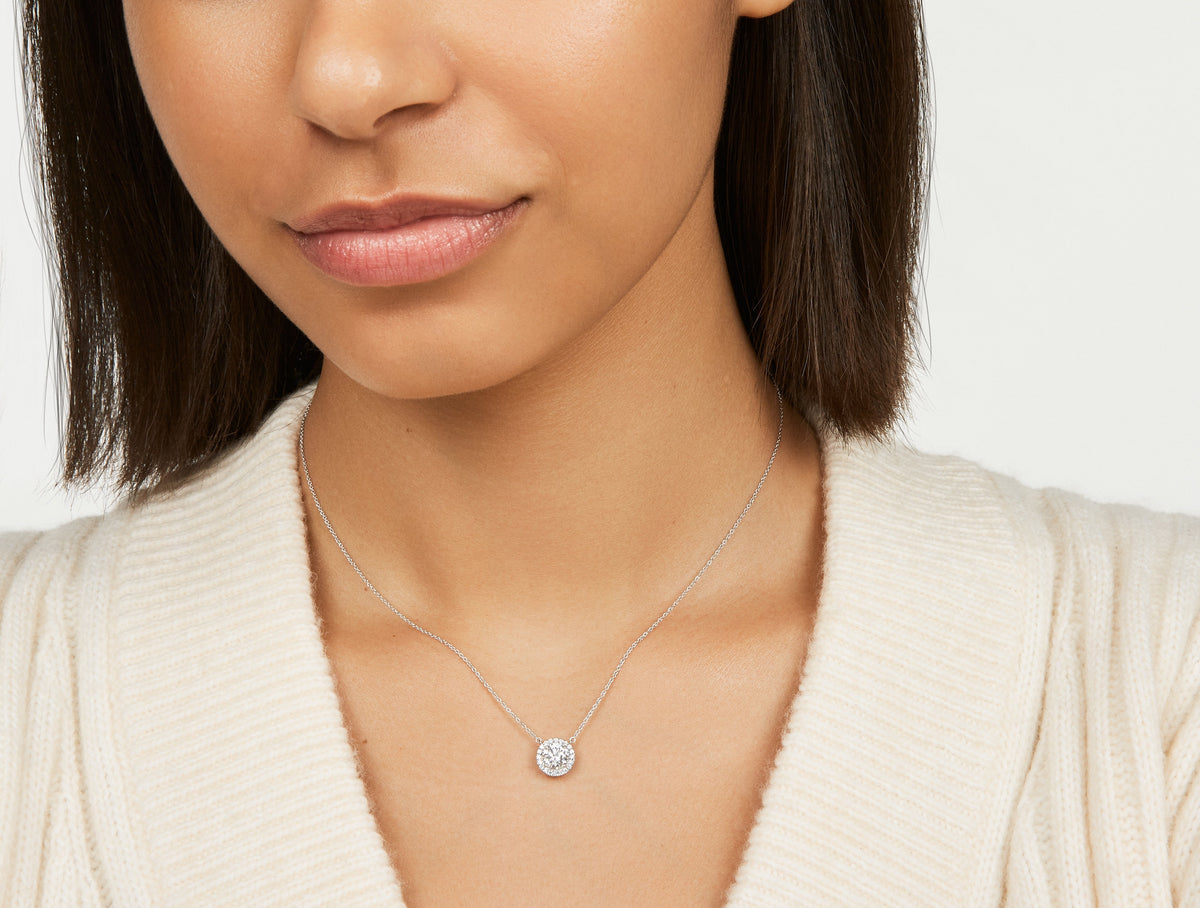 No jewelry collection is complete without a classic halo necklace. Set in 14k white gold, with a ⁸⁄₉ carat center stone surrounded by pavê, it is the perfect accessory for any outfit